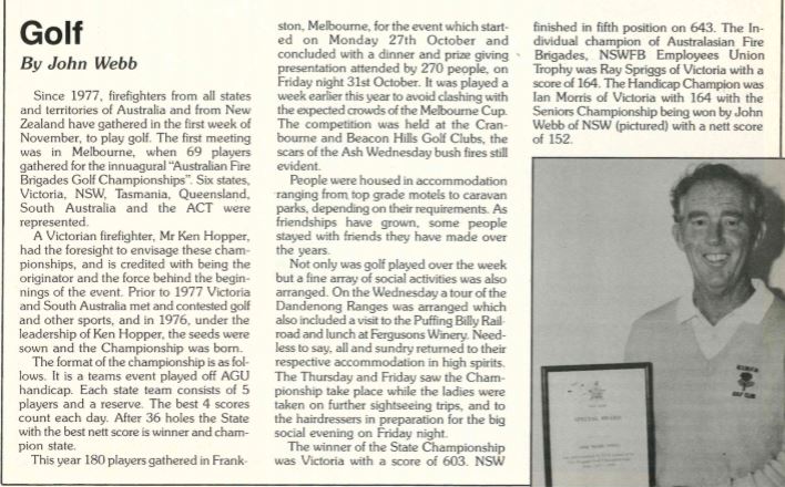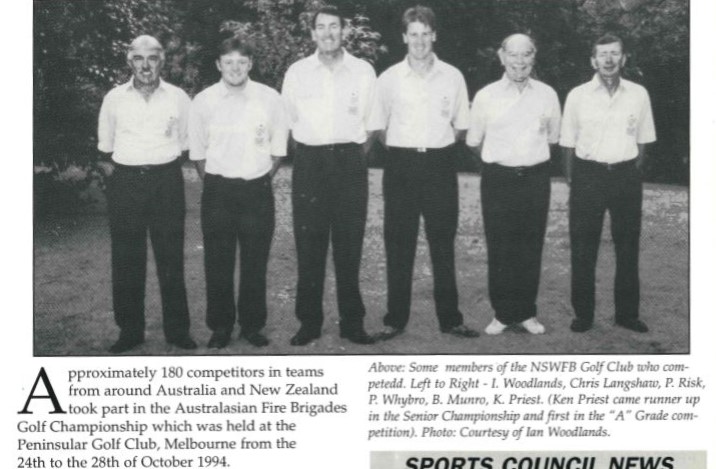 NSWFB Golf Club morphed out of the old A & C districts Golf Clubs around 1975, with John Webb instrumental in bringing the clubs together. Like all sports clubs within Fire + Rescue the Golf Club has had a succession of tireless organisers, committee & Captains over the years. The likes of John Davies, Dave Andrews, John Honeybrook, Paul Risk, Chris Windsor, Tony Mason, Mark Harrington, Gaz Malpass & Greg Flynn have kept the comradeship of our people together through Golf and laughter.