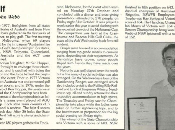 The NSWFB Golf Club attended the first Austalasian Fire Brigades Golf Championships in 1977 in Melbourne. Our team of 6 were successful taking out the championships and has been successful on 7 other occasions last in 2005. This year marks the 44th Annual Australasian Fire Brigades Golf Championships played at Moona Links in Victoria with all states and territories of Australia represented plus New Zealand. The event will bring together around 200 current serving & retired Fire Fighters together to enjoy the golf and social events. Like any national event this also takes the efforts of many to be successful and NSW has Ian Woodlands, Neville Duncan & Garry Munro recognised for their efforts and our Life Members of the Australasian Fire Brigades Golf Club. NSW will host the Championships in 2022 at Coffs Harbour.